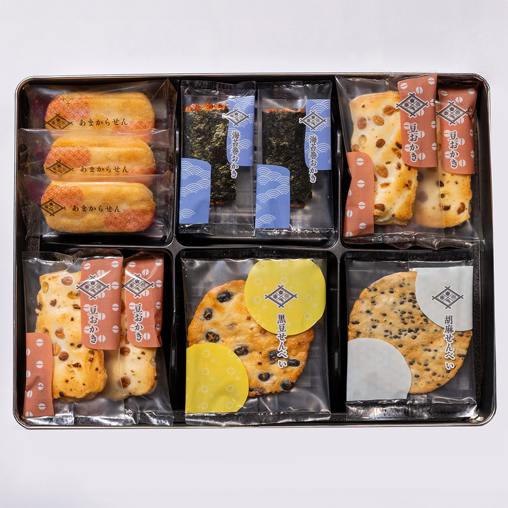 ■規格:あまからせん2枚×7袋・胡麻せんべい1枚×6袋・黒豆せんべい1枚×5袋・豆おかき1枚×10袋・海苔巻おかき1枚×8袋