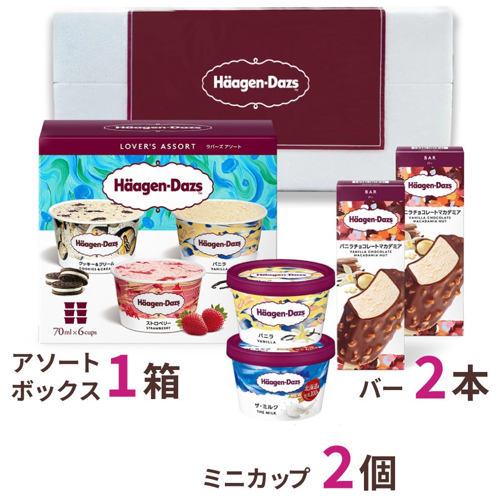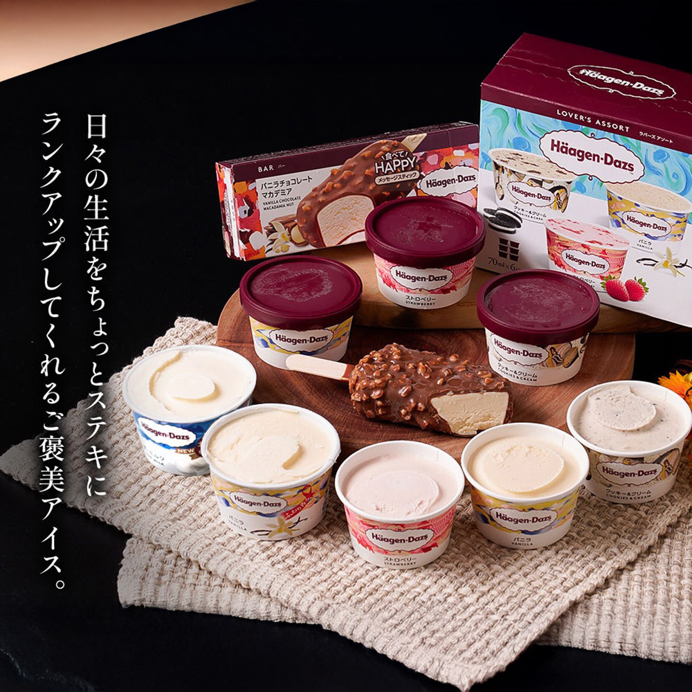 ■規格:ハーゲンダッツミニカップ各110ml×2(バニラ、ザ・ミルク)、【ラバーズアソート】各70ml×6(バニラ・ストロベリー・クッキー&クリーム×各2)、バー(バニラチョコレートマカデミア)80ml×2