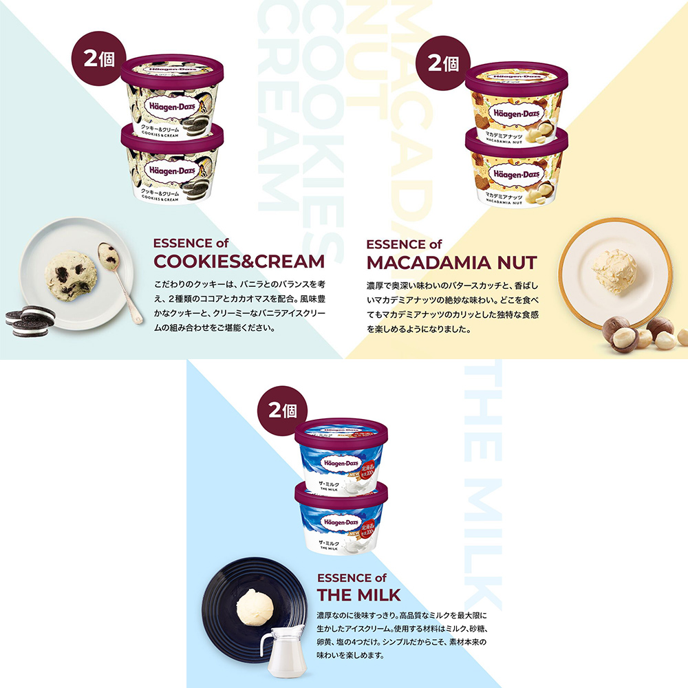 ■規格:ハーゲンダッツミニカップ各110ml(ストロベリー・グリーンティー×各3、クッキー&クリーム×2、ザ・ミルク×2、マカデミアナッツ×2)