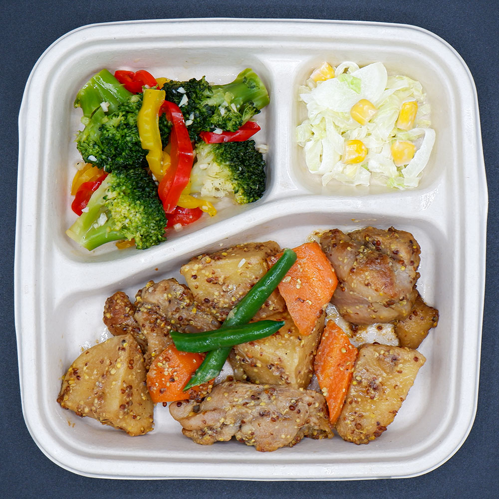 鶏肉を柔らかく仕上げたハニーマスタード焼きは、ポテトとの相性も抜群。ガーリックの風味が効いた副菜と程よい甘さのコールスロー。栄養バランスを意識したアメリカンメニューです。