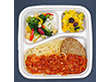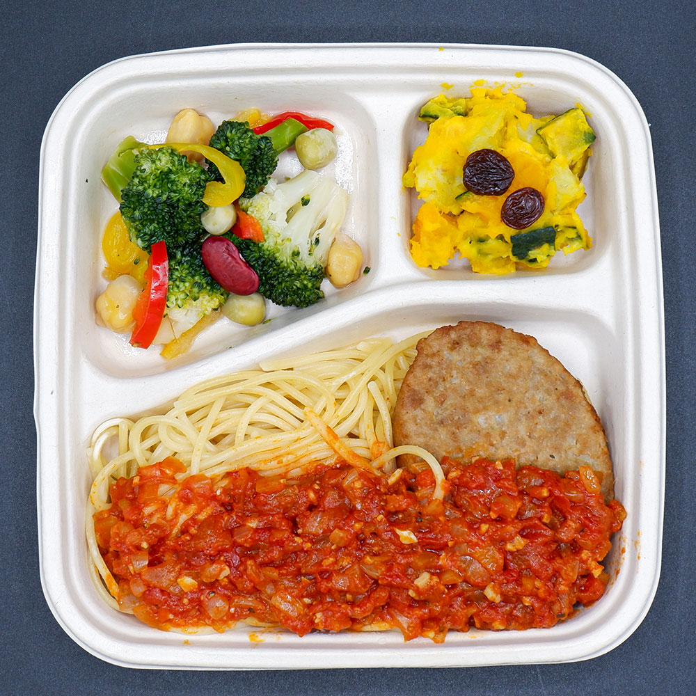 トマトソースハンバーグ(ハンバーグ、トマト・ピューレー漬、玉ねぎ、その他)(日本)、パスタ、ブロッコリーと彩り野菜の柚子サラダ(ブロッコリー、ガルバンゾー、マローファットピース、黄ピーマン、赤ピーマン、その他)(日本)、南瓜とさつま芋のクリームチーズ風味和え(南瓜、さつま芋、乳等を主要原料とする食品、サラダ用調味料、その他)(日本)/トレハロース、調味料(アミノ酸等)、リン酸塩(Na、K)、pH調整剤、着色料(カラメル)、増粘剤(加工デンプン、増粘多糖類)、グリシン、(一部に小麦・卵・乳成分・大豆・鶏肉・豚肉・りんご・ゼラチンを含む)