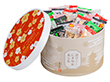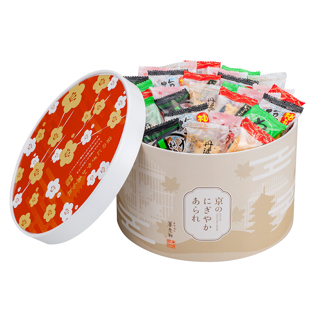 和をイメージした可愛いパッケージに、色んな味のあられをいっぱい詰め込みました。