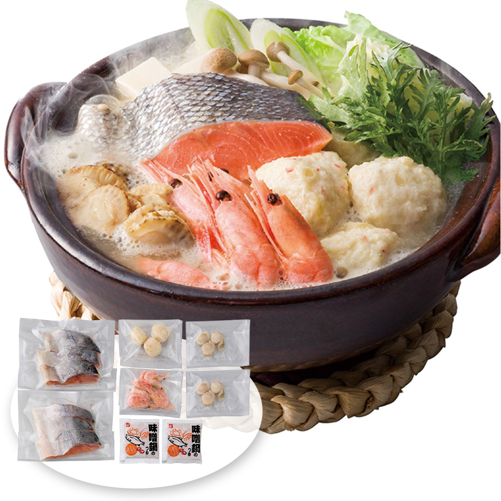 ■規格:秋鮭切身60g×6切・ボイル甘えび6尾・ボイル帆立6個・つまみ揚げ(カニ風味)3個・味噌鍋のタレ50g×2個・約3~4人前