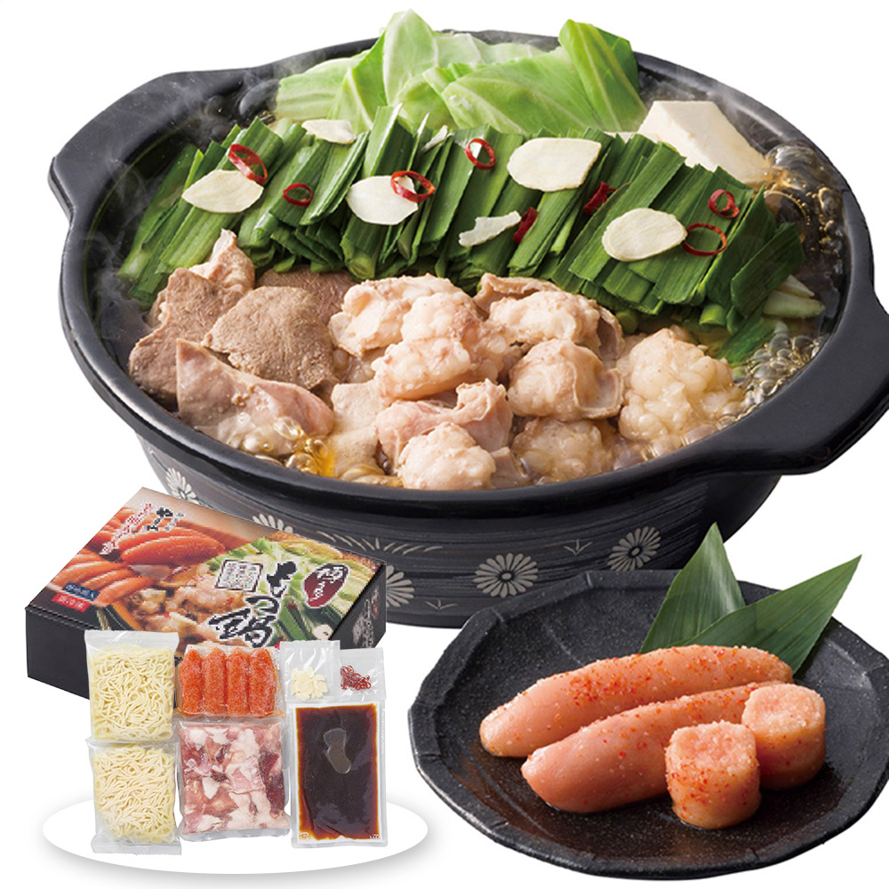 ■規格:もつ鍋醤油(牛もつ(牛小腸、牛ハツ、ギアラ)350g・鍋用スープ(濃縮タイプ)200g・にんにく2.5g・唐辛子0.5g各1個・ちゃんぽん麺150g×2個・約1~2人前)・辛子明太子(無着色)3~7本(約150g)