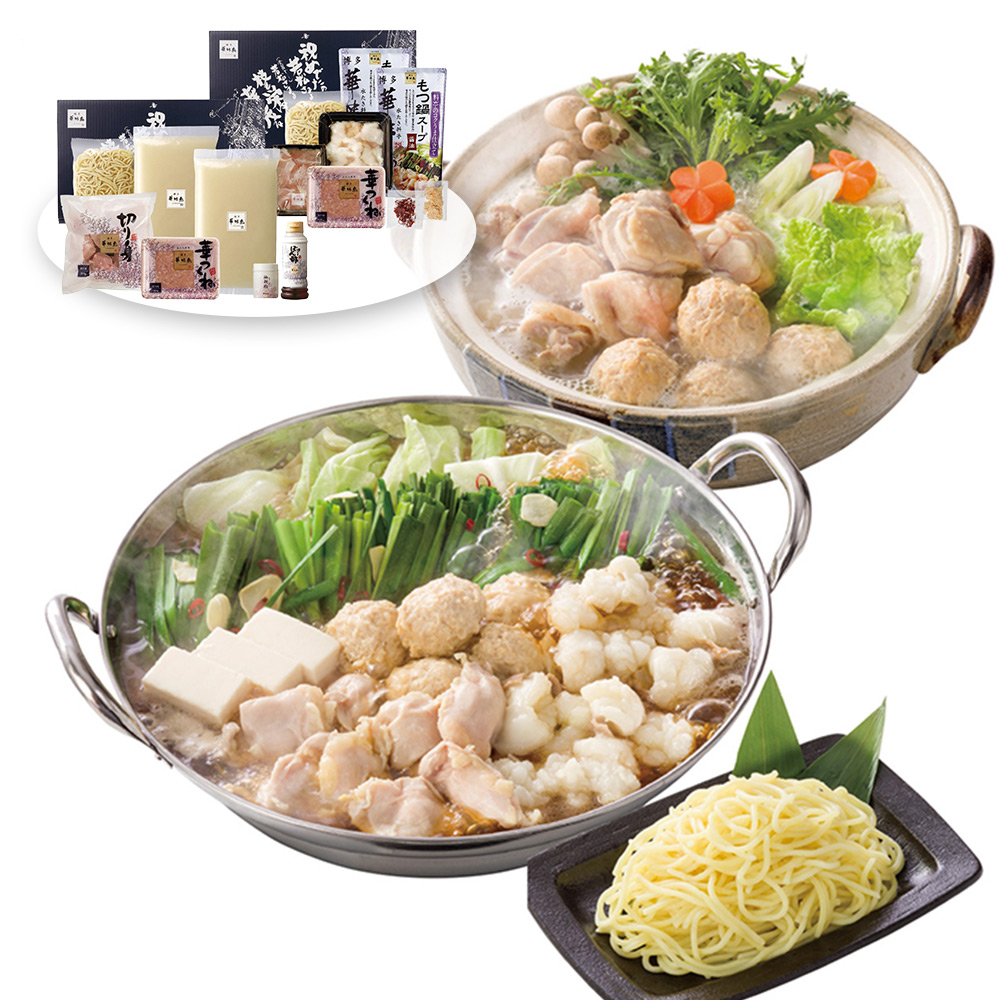 水たきともつ鍋。博多の2大鍋がお楽しみいただけるセットです。【水たき】博多・中洲に本店を構え、大阪・東京にも店舗展開する「水たき料亭博多華味鳥」の吟味されたスープと素材がご家庭でお楽しみいただけます。水たき料亭オリジナルのぽん酢と一緒にご賞味下さい。【もつ鍋】博多が全国に誇るスタミナ食の代表「もつ鍋」は新鮮な「もつ」とスープが決めてです。水たき料亭「華味鳥」流にアレンジを加え、九州産「華味鳥」のハラミと牛もつとを組み合わせたオリジナルなもつ鍋セットを作りました。プリップリの牛小腸に鶏の中で少量しか取れないハラミを加えることで、醤油味のもつ鍋スープとも相性の良い食べやすくボリューム感のあるもつ鍋に仕上がりました。キャベツやにらを加えてお召し上がりいただいた後は、ちゃんぽん麺でしめくくるところまで博多の醍醐味をご家庭でたっぷり楽しんでいただけるセットです。