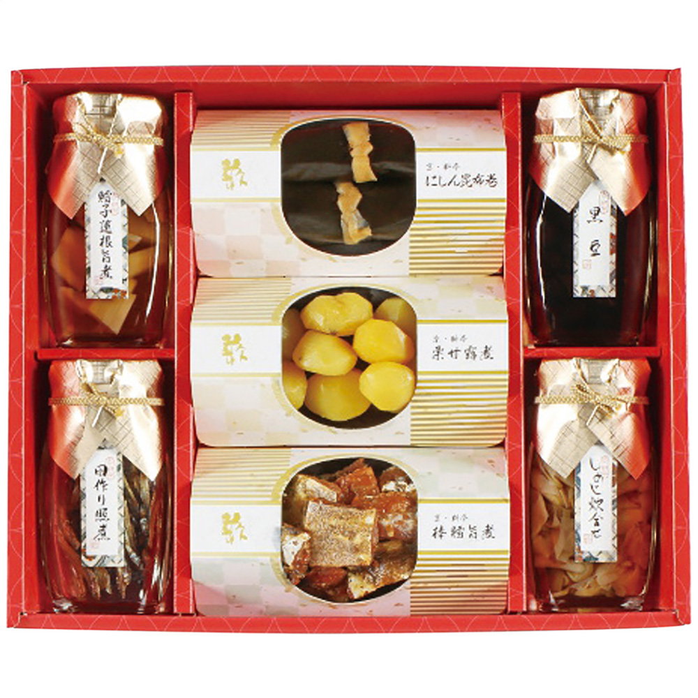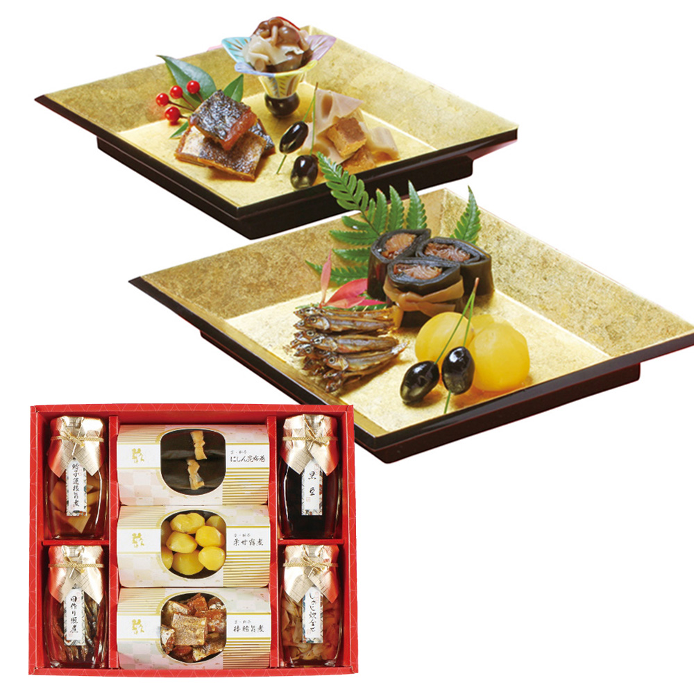 ■規格:栗甘露煮55g・にしん昆布巻2本入・棒鱈旨煮85g各1個・田作り照煮20g・黒豆45g・しめじ炊合せ50g・鱈子蓮根旨煮40g各1瓶