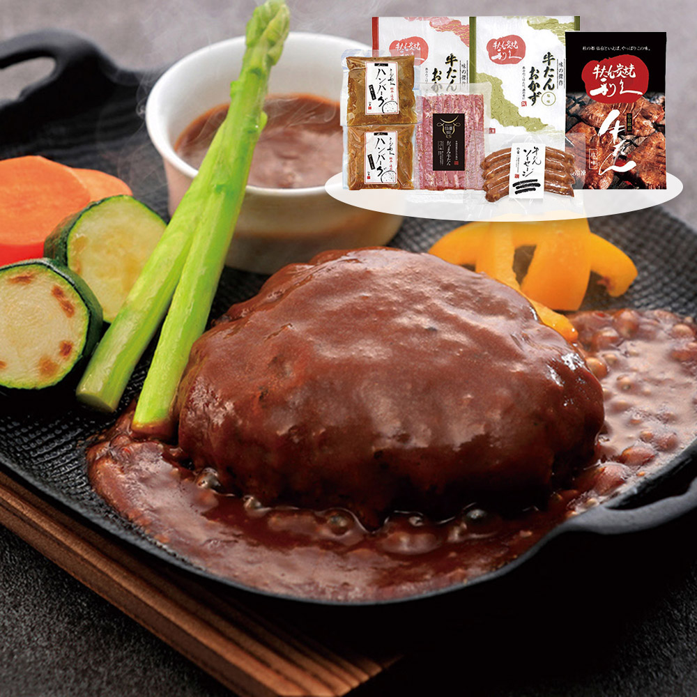■規格:牛たん真空パック(塩味)100g・牛たんおかず120g(塩味・味噌味)・牛たんハンバーグ200g(デミソース・和風ソース)・おつまみ牛たんペッパー50g・牛たんソーセージ120g各1個