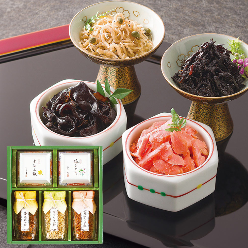 ■規格:梅ひじき50g・木耳山椒50g各1個・ちりめん山椒30g・海老わかめ65g・ちりめんくぎ煮45g各1瓶