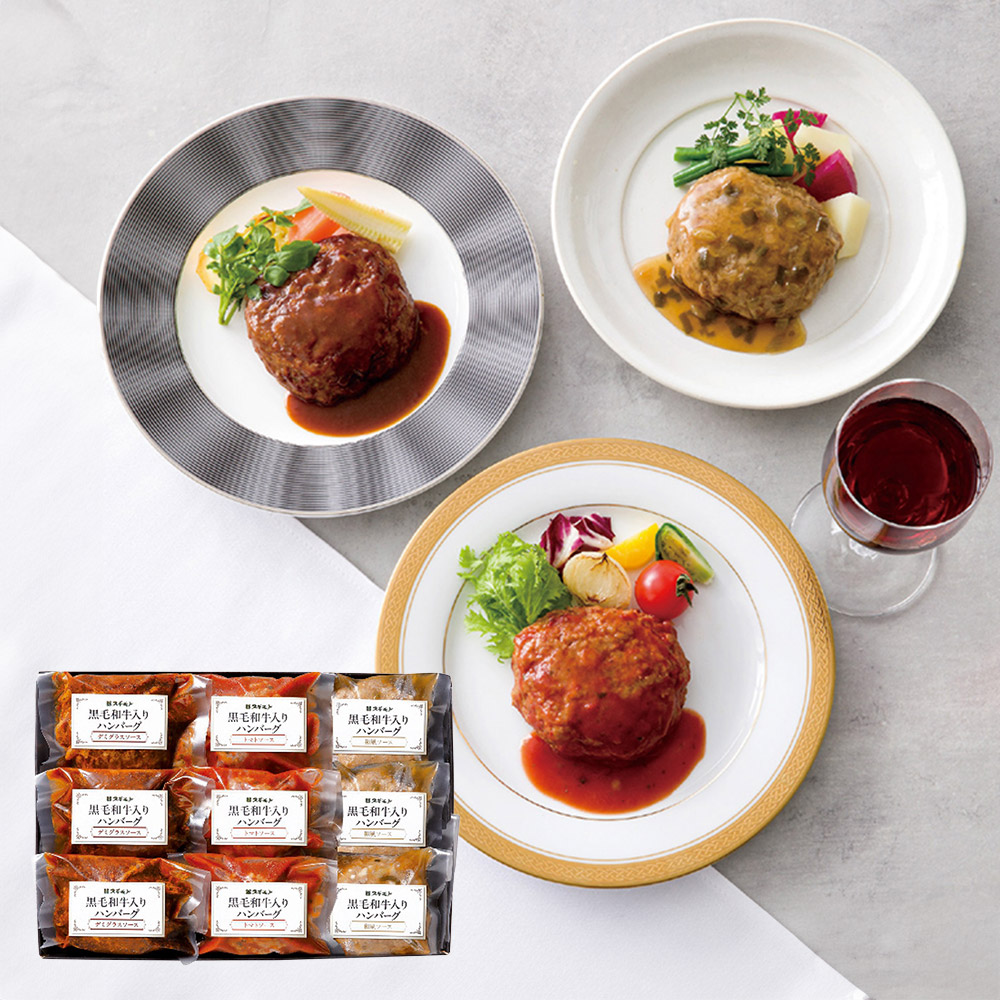 ■規格:黒毛和牛入りハンバーグ(デミグラスソース・和風ソース・トマトソース各3個・各120g)