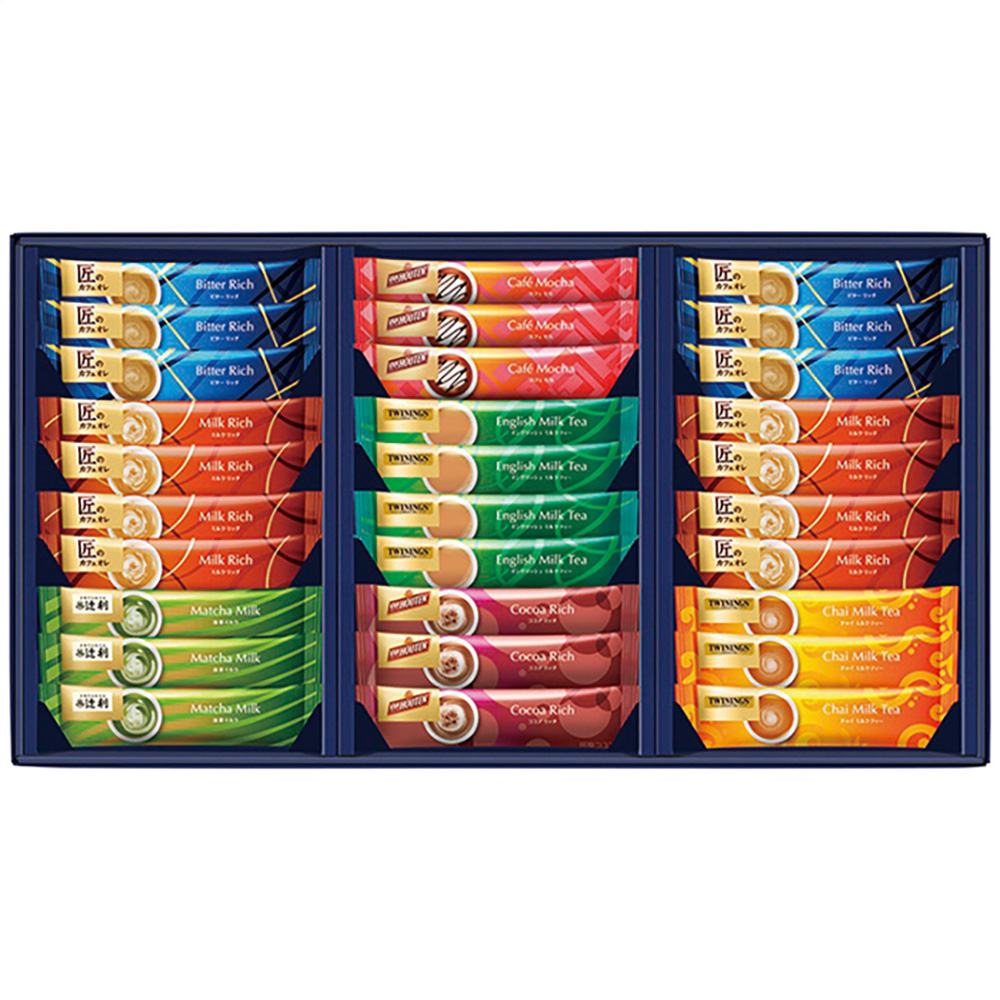 ■規格:匠のカフェオレ(ミルクリッチ12.4g×8本・ビターリッチ10.6g×6本)・トワイニング(イングリッシュミルクティー4本・チャイミルクティー3本・各14.9g)・辻利抹茶ミルク17g×3本・バンホーテン(ココアリッチ18g・カフェモカ15g各3本)