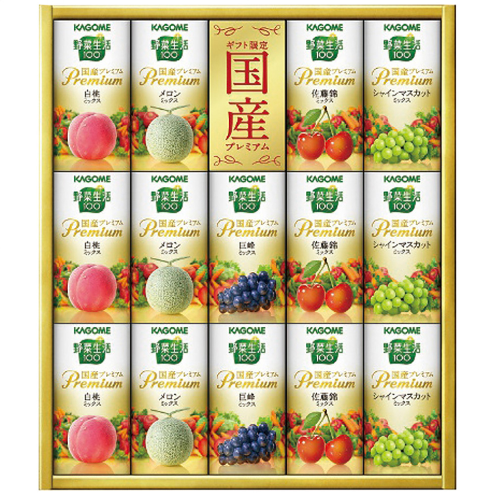 ■規格:野菜生活100国産プレミアム(白桃ミックス・メロンミックス・佐藤錦ミックス・シャインマスカットミックス各3本・巨峰ミックス2本)・各125ml