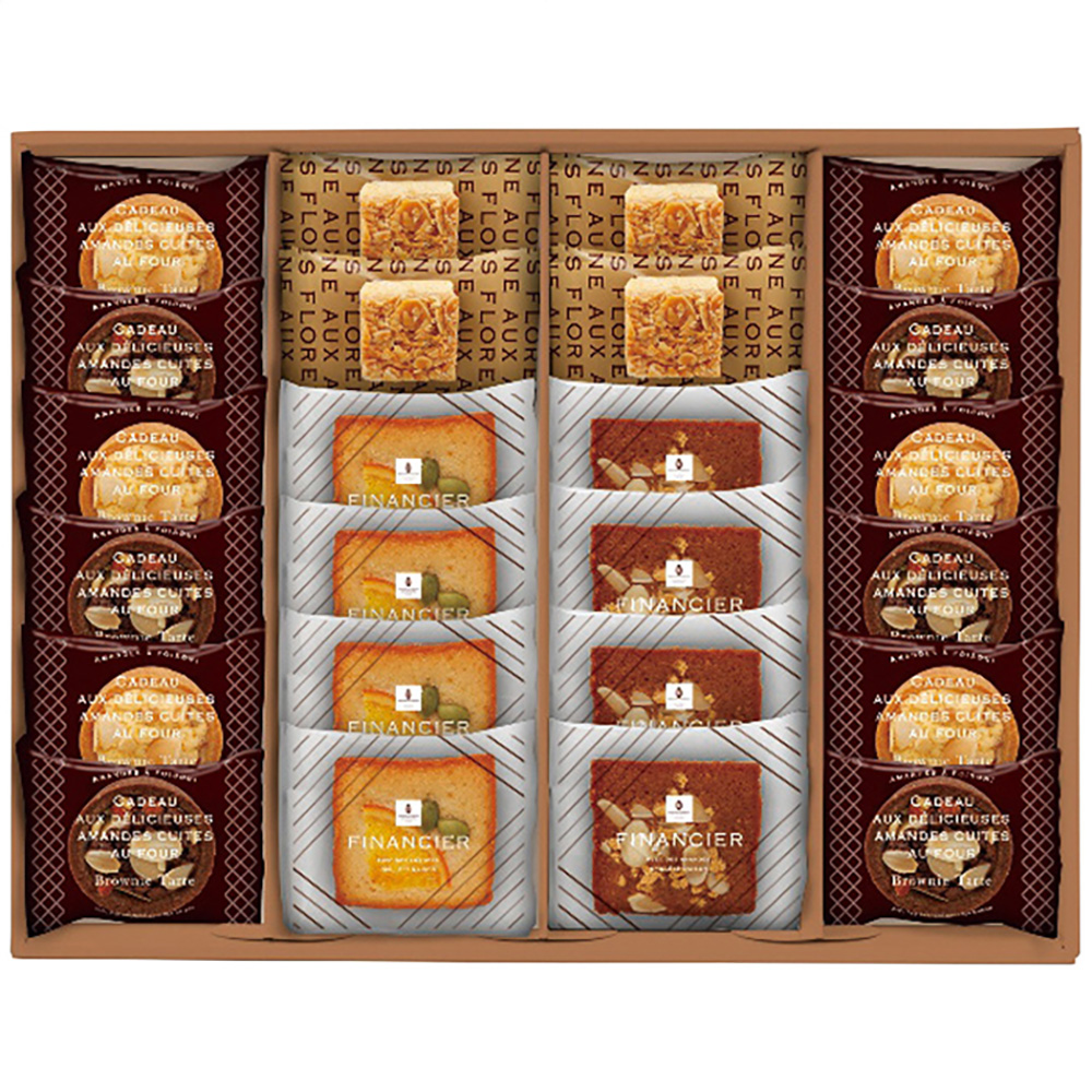 ■規格:フィナンシェ(オレンジ・キャラメルアーモンド)・フロランタン各4個・タルト(ブラウニー・ホワイトブラウニー各6個)