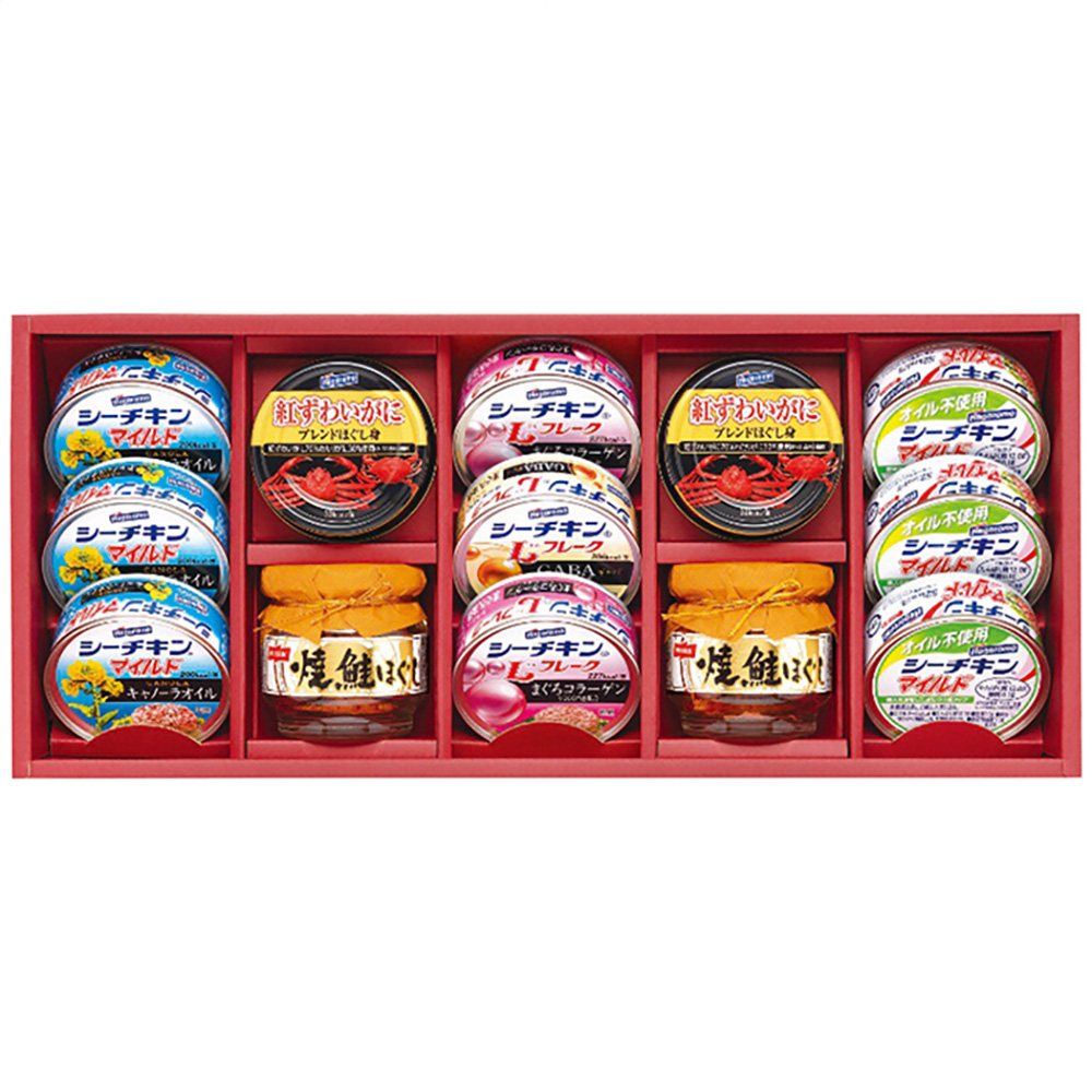■規格:シーチキンマイルドキャノーラオイル・オイル不使用シーチキンマイルド各3缶・シーチキンLフレークコラーゲン入り2缶・シーチキンLフレークGABA入り1缶・各70g・紅ずわいがにブレンドほぐし身55g×2缶・焼鮭ほぐし50g×2瓶
