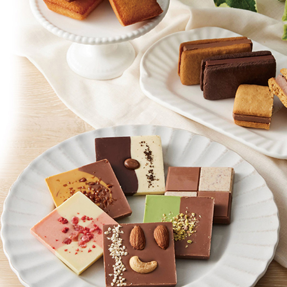 ■規格:タブレット(クッキーミルク・ミルクキャラメル・ティラミス・ピスタチオ・ミルク&ナッツ・ホワイトストロベリー各1枚)・フィナンシェ(ホワイト2個・ミルク1個)・ショコラサンド(ビター・キャラメル各1個)