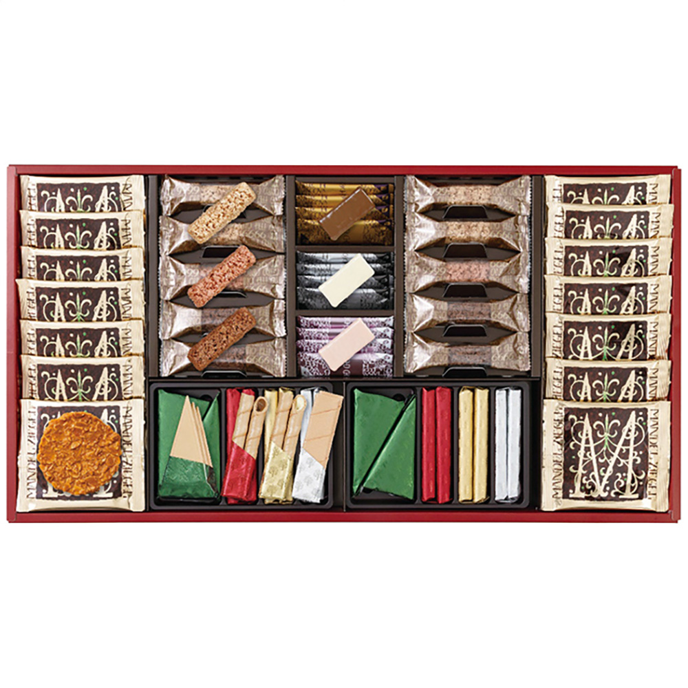 ■規格:エコルセ(三角4包(12枚)・短冊4包(8枚)・丸型(ミルクチョコ・ホワイトチョコ)各4包(各8本))・マンデルチーゲル14枚・米粉クランチ(ミルクチョコ・ホワイトチョコ各4個・ラズベリーチョコ2個)・ショコラエコルセ(ミルクチョコ・ホワイトチョコ・ストロベリーチョコ各4枚)
