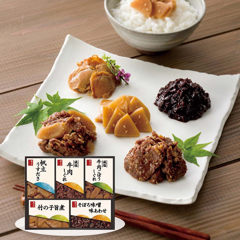 ■規格:減塩牛肉しぐれ50g・減塩牛肉ごぼうしぐれ50g・竹の子旨煮50g・帆立うすだき40g・そぼろ味噌味あわせ90g各1個