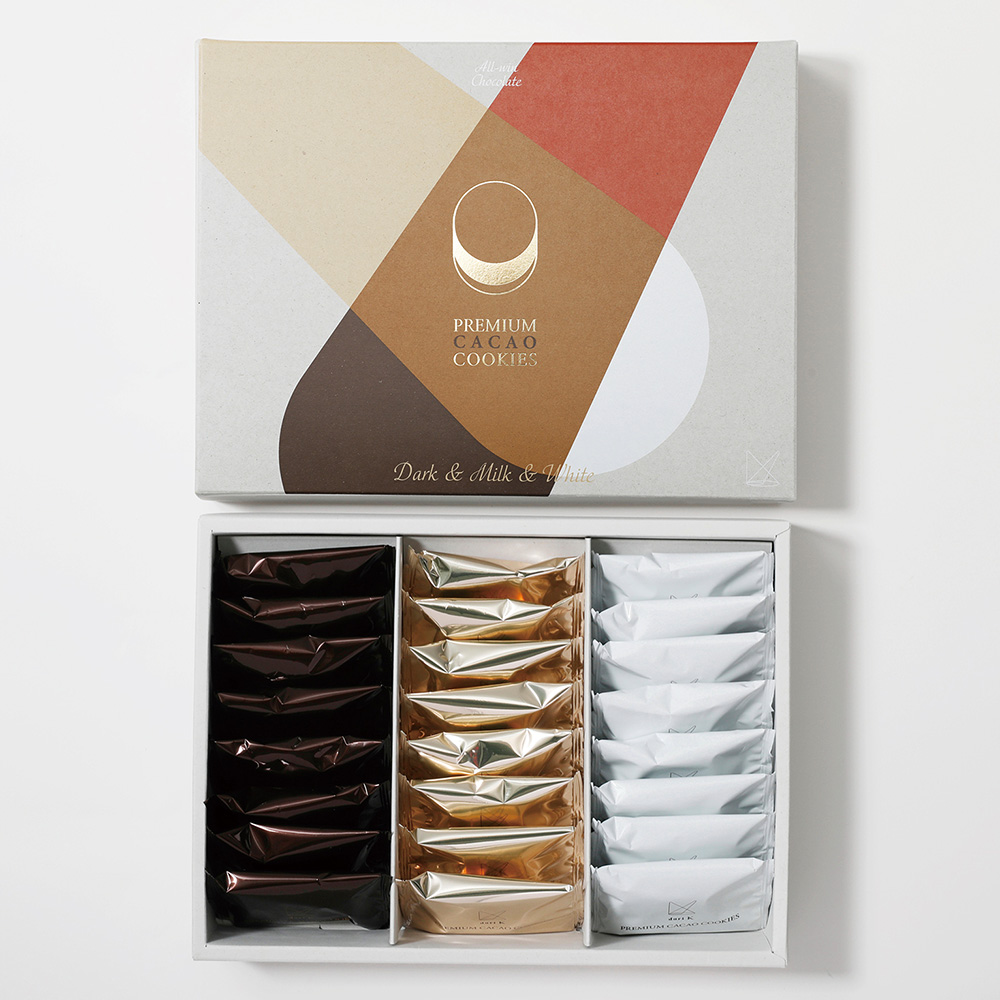 厚みのあるチョコレートをラングドシャ生地でサンド。カカオの重厚感と酸味が特徴の「ダーク」、優しい甘さの「ミルク」、ココアバター由来のコクが豊かな「ホワイト」。3種類のフレーバーが8枚ずつ入っています。