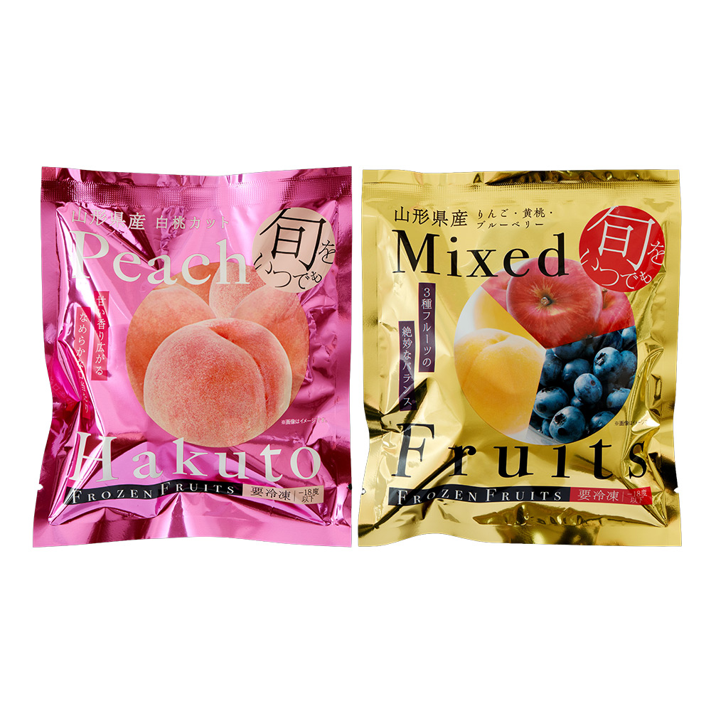 山形で育った完熟の白桃とりんごと黄桃、ブルーベリーをミックスしたパックの2種を、一番おいしい旬のタイミングで、急速冷凍しました。