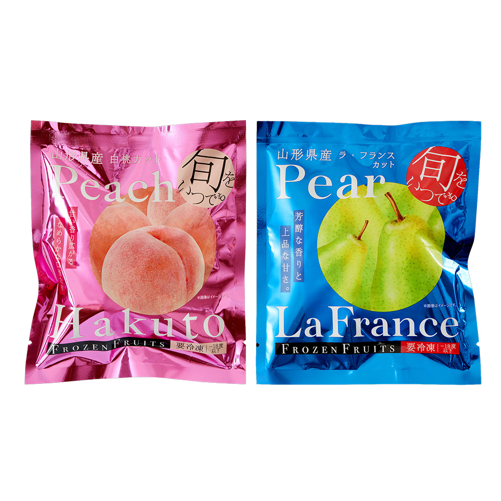 山形で育った完熟の白桃と、育った歯触りのいいジューシーなラ・フランスの2種を、一番おいしい旬のタイミングで、急速冷凍しました。