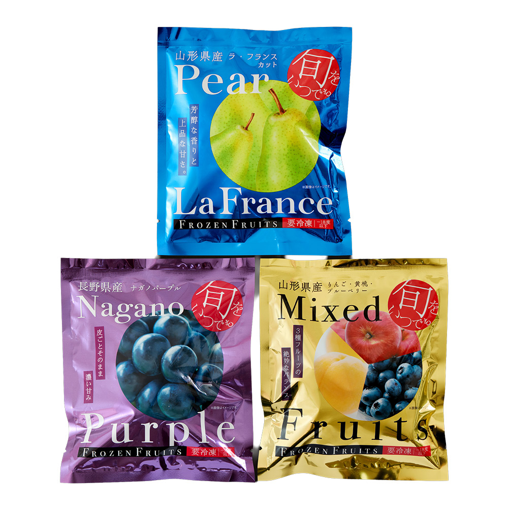長野で育った深い紫色の美しい果皮のナガノパープルと、山形で育った歯触りのいい甘くてジューシーなラ・フランス(洋ナシ)、それとりんごと黄桃、ブルーベリーをミックスしたパックの3種を一番おいしい旬のタイミングで、急速冷凍しました。半解凍でシャーベットでお召し上がりいただくほか、ジュースやお酒の氷の代わりとして、スムージーやデザートのトッピングなど、フルーツ本来の香りや甘さをお楽しみください。