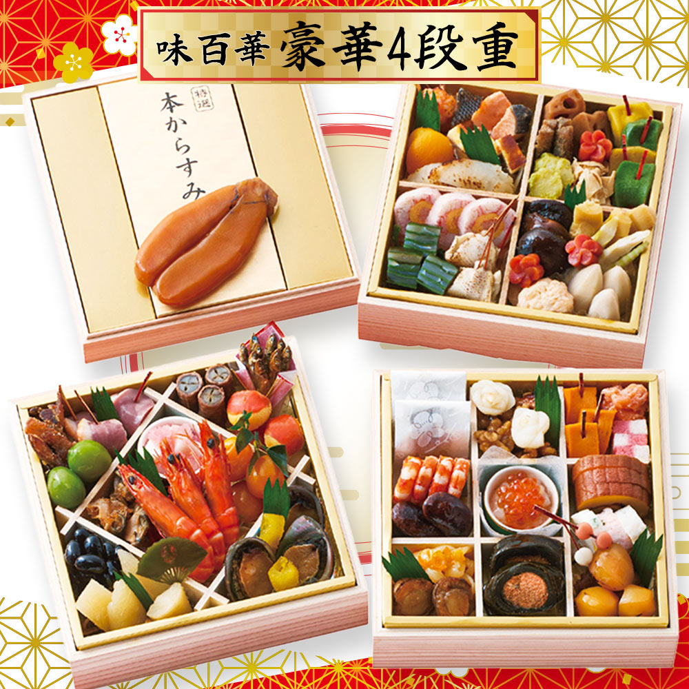 【おせち2026】味百華 おせち 四段重 58品目 約3~4人前 9818-028【送料込み】【二重包装不可】【お届け不可地域:北海道・沖縄・離島】【12月30日お届け】【時間指定不可】