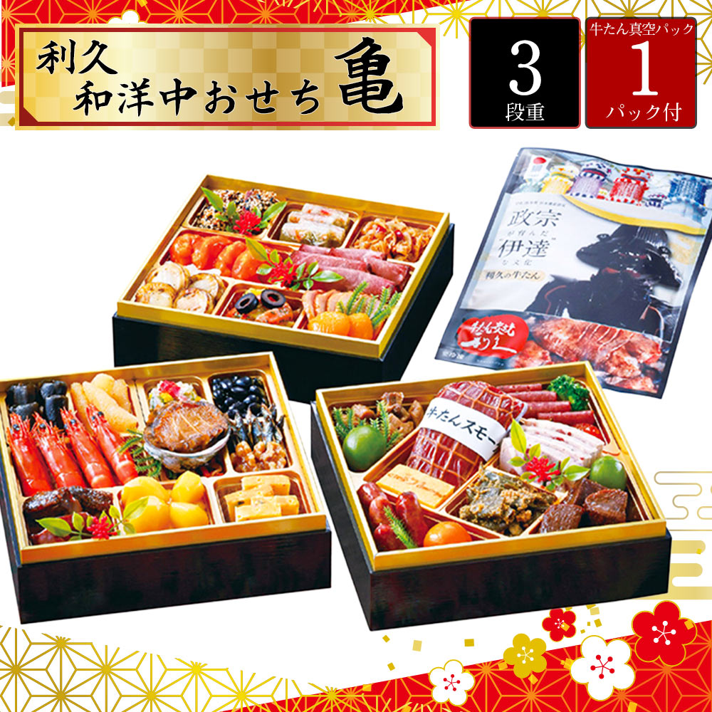 わが街とくさんネット TOP ≫ 惣菜・食材 ≫ 【おせち2026】利久 和洋中おせち 三段重【亀】 37品目 約3~4人前 9819-018【送料込み】【二重包装不可】【お届け不可地域:北海道・沖縄・離島】【12月30日お届け】【時間指定不可】