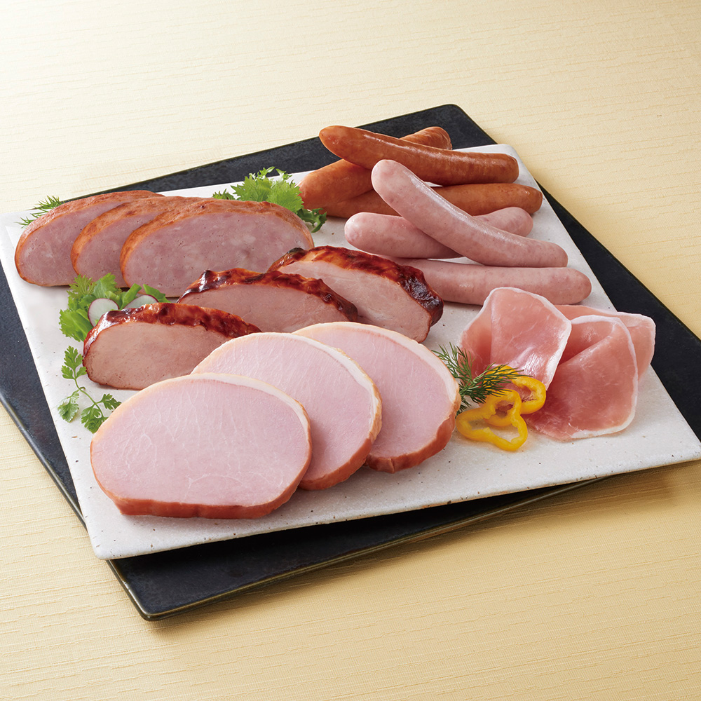 ■規格:特選ロースハム400g 焼豚二段加熱仕立て160g  特選ホワイト肩ロースハム180g 特選ロースハム60g 特選ロースハム60g 特選あらびき燻しウインナー80g 特選あらびき芳醇ウインナー80g しっとりロース生ハム45g