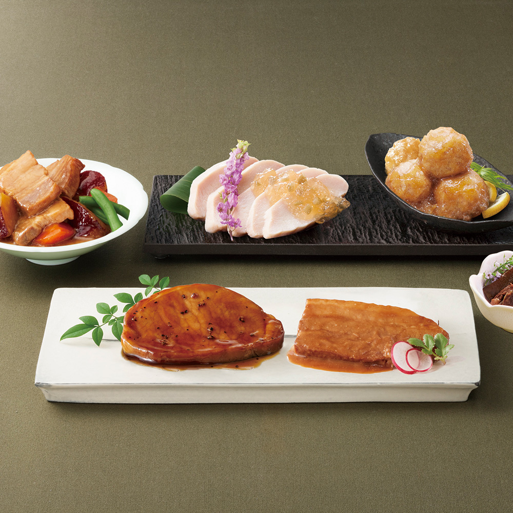 ■規格:牛しぐれ煮ごぼう55g 豚肉とさつま芋の甘辛煮150g 蒸し鶏の梅ジュレ仕立て150g 豚ロースの醤油煮込み70g 豚ばらの味噌煮込み70g つくねの蕪みぞれ仕立て180g