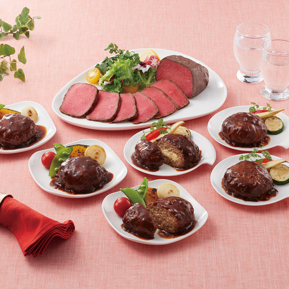 ■規格:低温真空調理ローストビーフ(もも)200g トリュフ入りグレイビーソース30g デミグラスソースハンバーグ120g×3  デミグラスソースチーズ入りハンバーグ120g×3