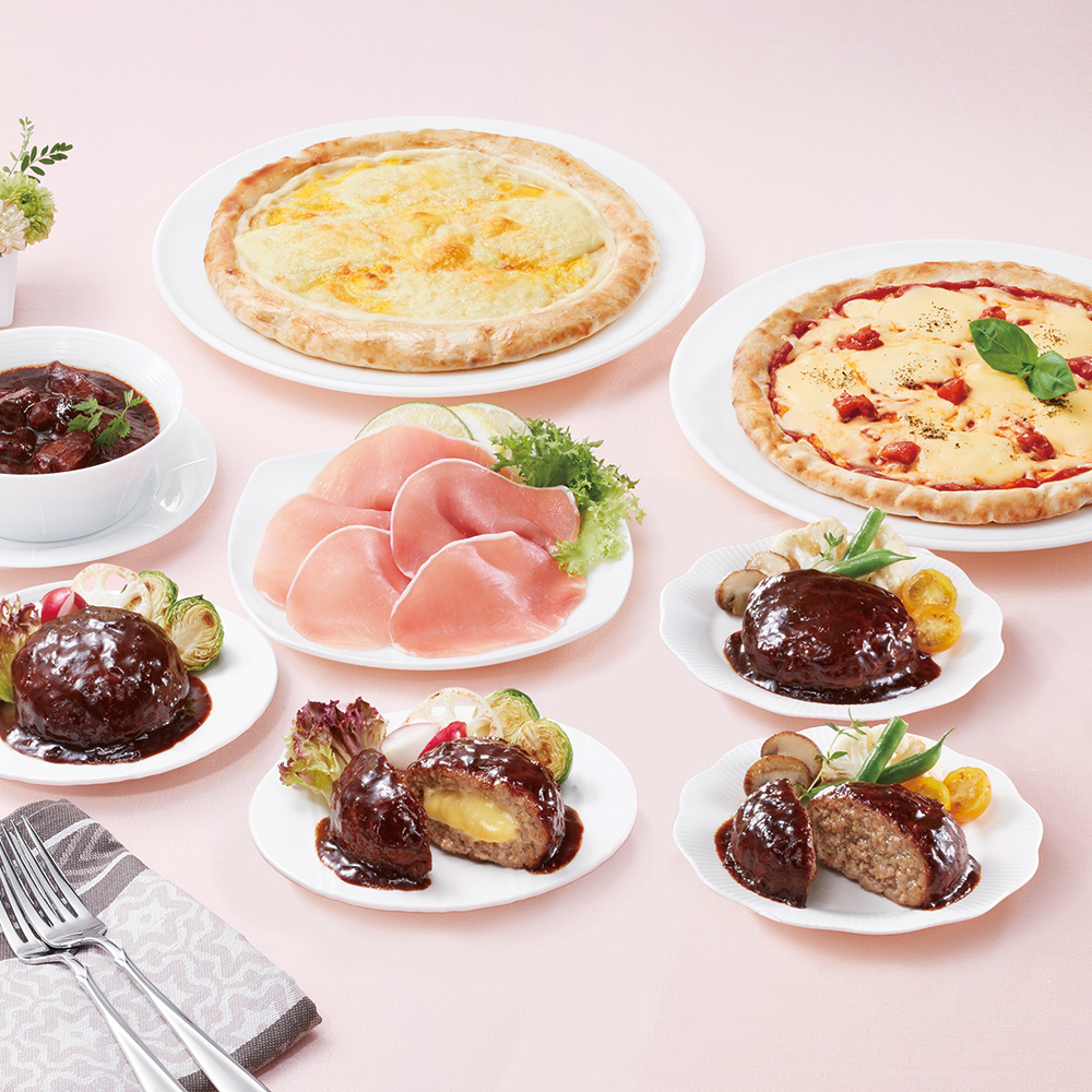 ■規格:ピザ4種のチーズスペシャリテ260g ピザマルゲリータスペシャリテ270g 生ハムスライス45g デミグラスソースハンバーグ120g デミグラスソースハンバーグ120g デミグラスソースチーズ入りハンバーグ120g デミグラスソースチーズ入りハンバーグ120g ビーフシチュー180g