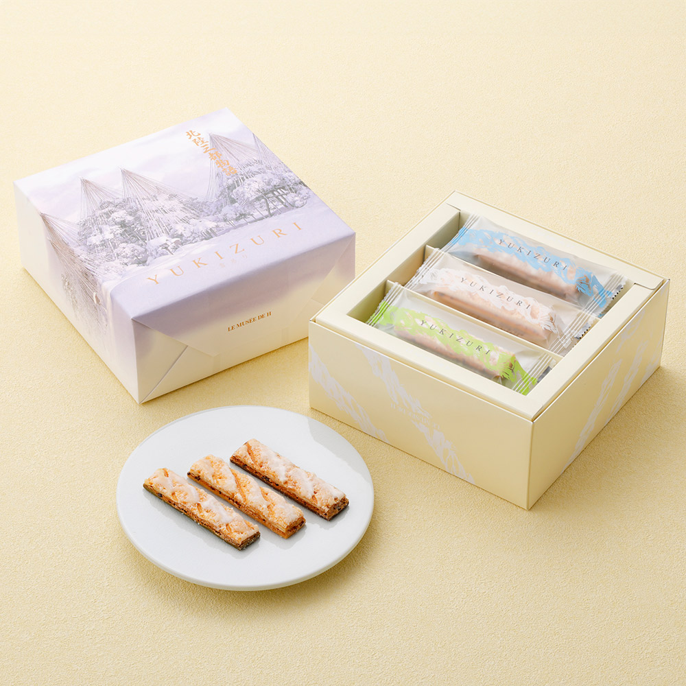 YUKIZURI:雪吊りの縄をイメージし、前田家の“梅鉢紋”から石川県産の梅酒・卵・米粉を使い、フランス伝統菓子のサクリスタンをヒントに焼きあげました。縄に積もった雪に見立てたシュガーの中に、ほのかに香る梅の味をお楽しみください。