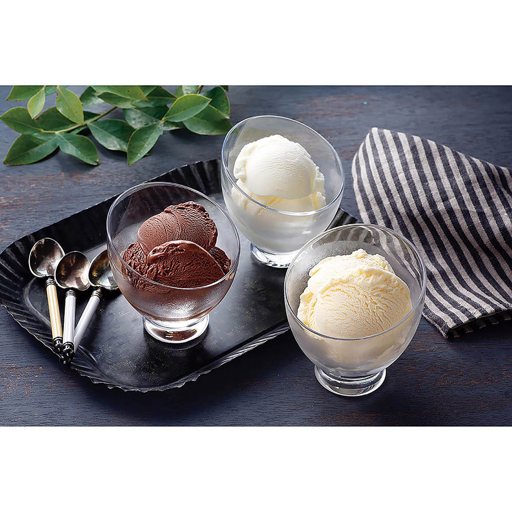 北海道産牛乳を使用した濃厚なプレミアムバニラ。チーズの程よい酸味を活かしたクリームチーズ、ちょっぴりビターなチョコの3種類のセット。