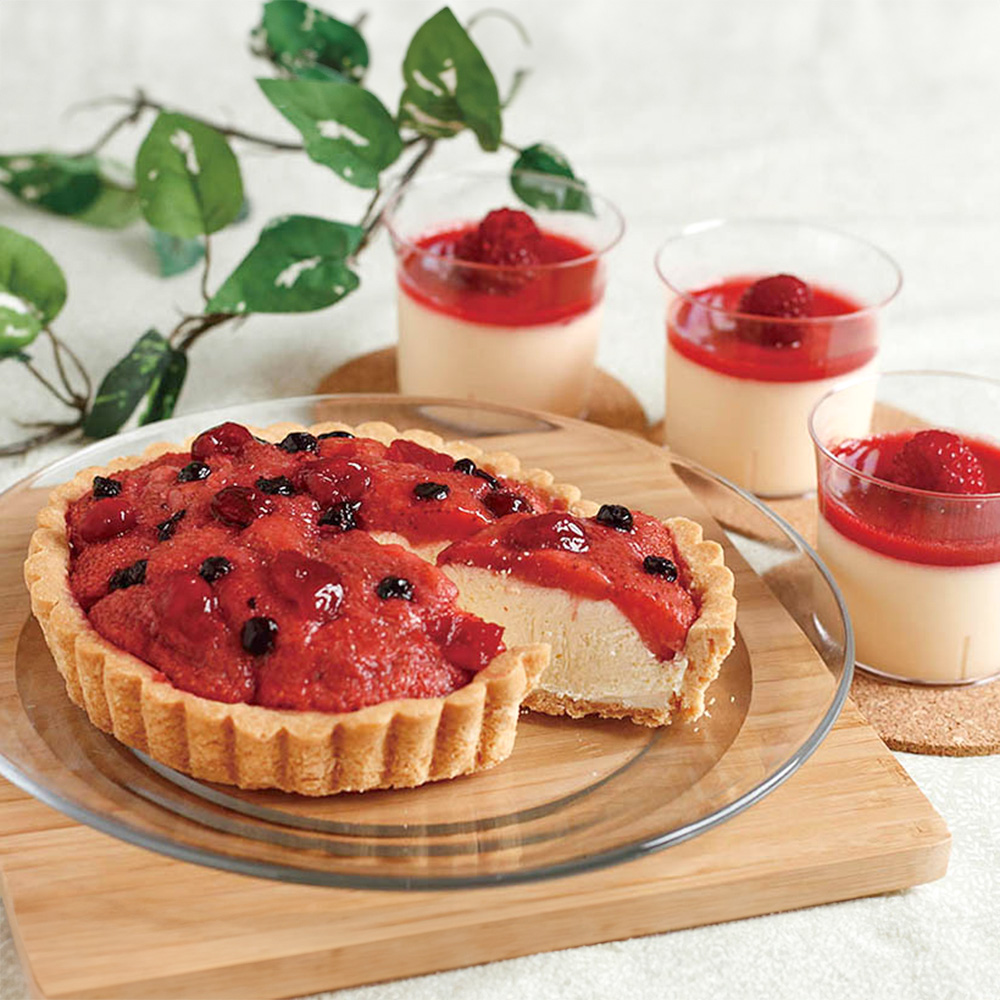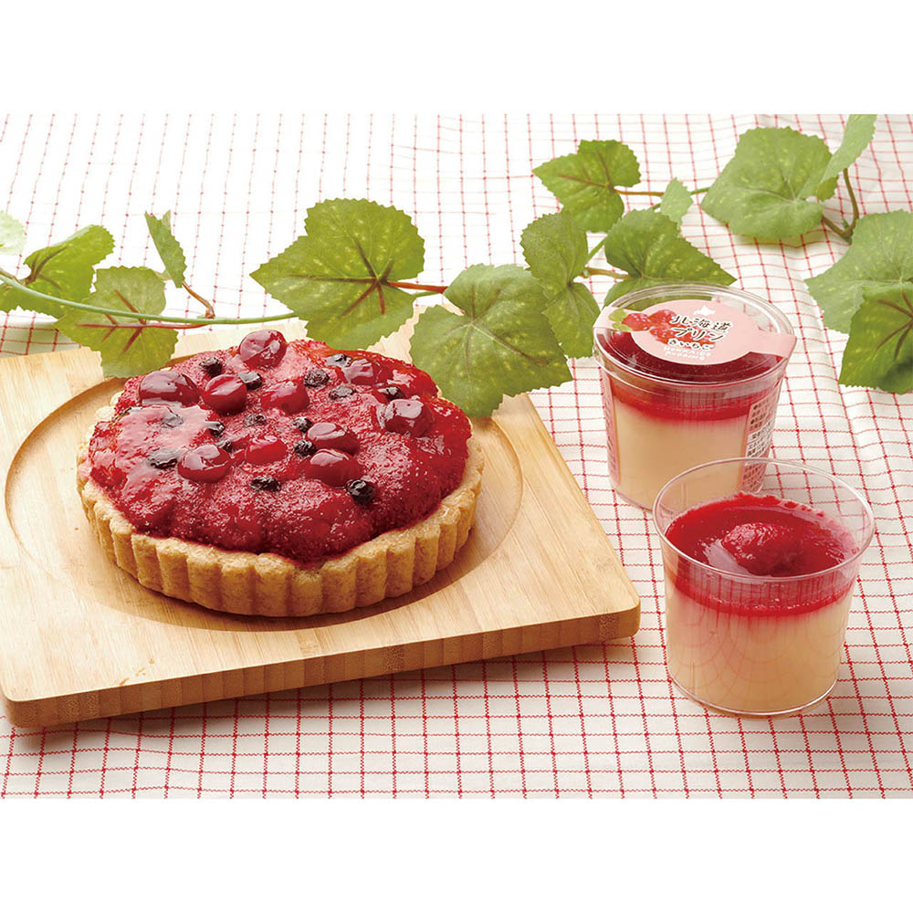 北海道産クリームチーズを使用しストロベリーなどの甘酸っぱいベリーを乗せたタルトケーキと北海道産の牛乳を使用したプリンに「木苺ソース」をかけたプリン。