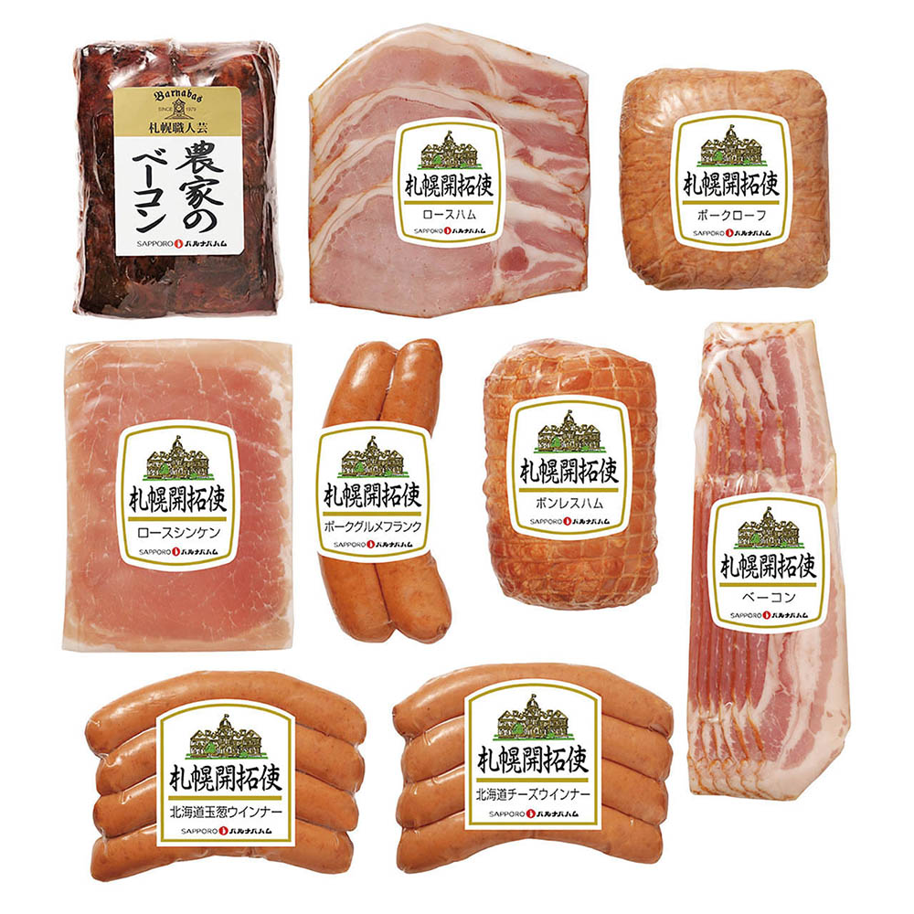 ■規格:ボンレスハム300g 農家のベーコン400g ポークローフ170g 北海道産チーズウインナー100g 北海道玉葱ウインナー100g ポークグルメフランク120g ベーコンスライス80g ロースシンケン40g ロースハム65g