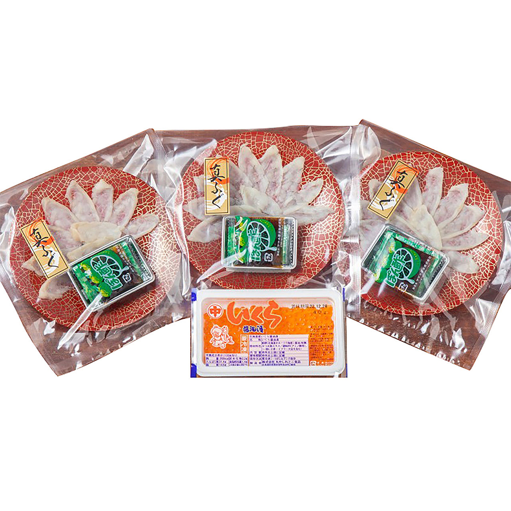 高級品として名高いふぐ。そんなふぐ料理の中でも代表とされるてっさ(薄造り)と北海道周辺海域で水揚げされた鮭を独自の調味液で丹念に漬けこんだいくらの詰合せです。