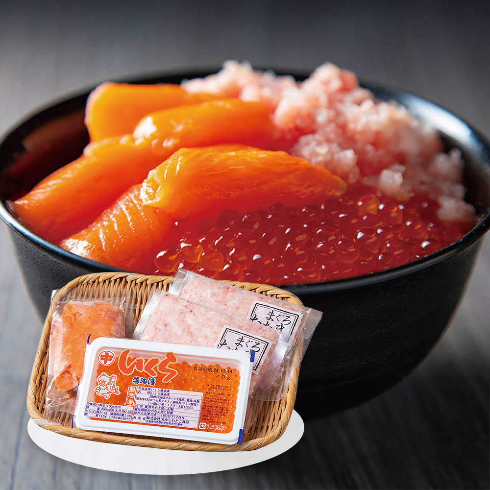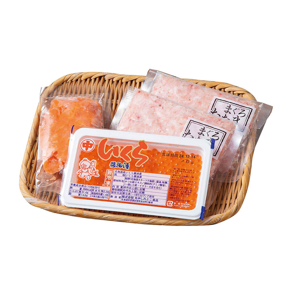■規格:北海道産いくら?油漬け40g・サーモン切落し80g×各1、まぐろたたき80g×2