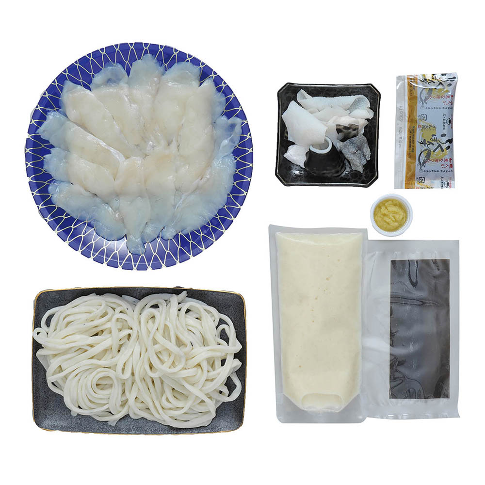 ■規格:まふくスライス150g、とらふくコラーゲンしゃぶ用皮40g、とらふく入りうどん250g、生姜(塩入り)16g、だし用昆布1枚、豆乳鍋の素180ml、ポン酢35g