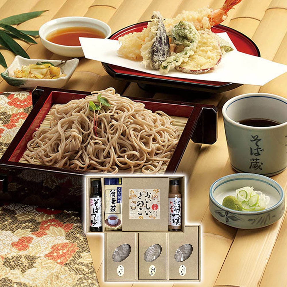 ■規格:半生八割そば100g×4袋・半生五割そば100g×2袋・そば屋のそば茶120g×1袋、ごまくるみ味噌つゆ2倍濃縮200ml・信州そばつゆ3倍希釈200ml×1瓶・おいしいきのこ320g(液込)