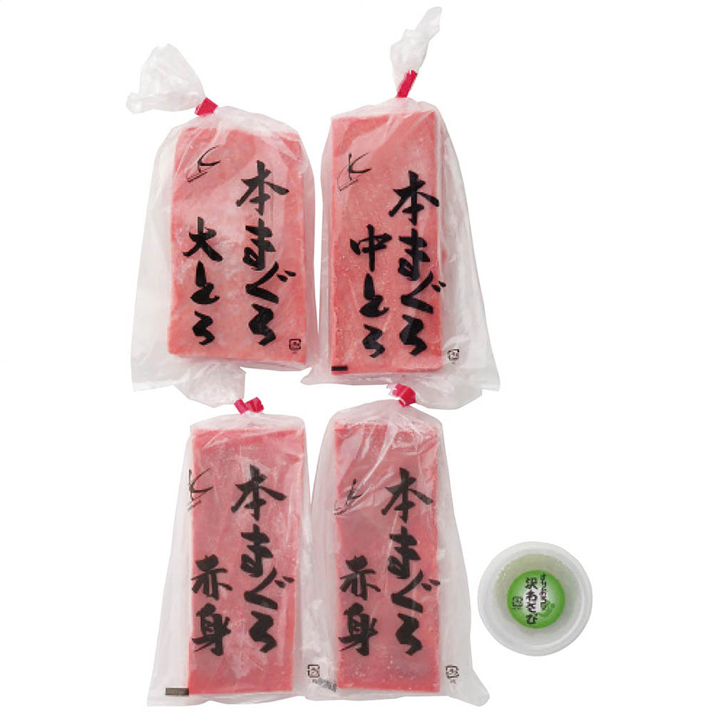 ■規格:本鮪赤身約200g×2個・本鮪中トロ約200g・本鮪大トロ約200g・わさび25g各1個