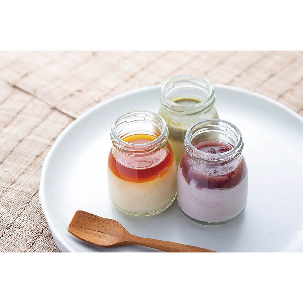 口当たりなめらかなプリンにこだわりの自家製餡の小倉・みたらし・ピスタチオの3種類をたっぷり加えた和風プリンです。