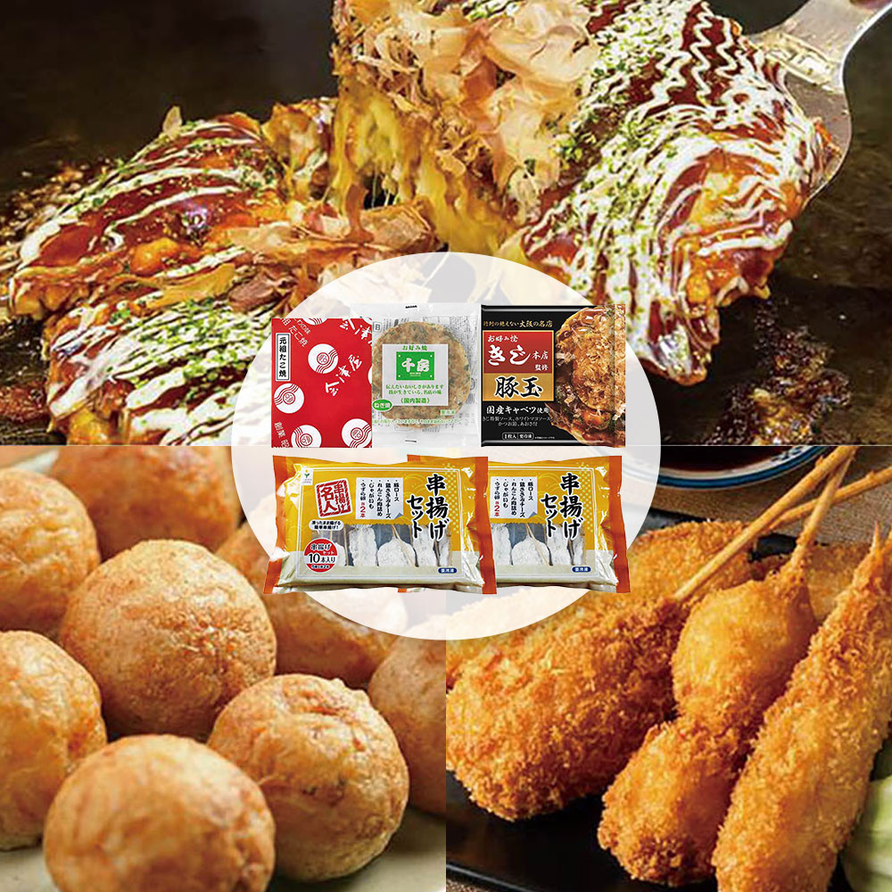 ■規格:串揚げセット(10本)220g×2、元祖たこ焼き(12個入)150g・きじ豚玉256g・千房ねぎ焼き180g×各1