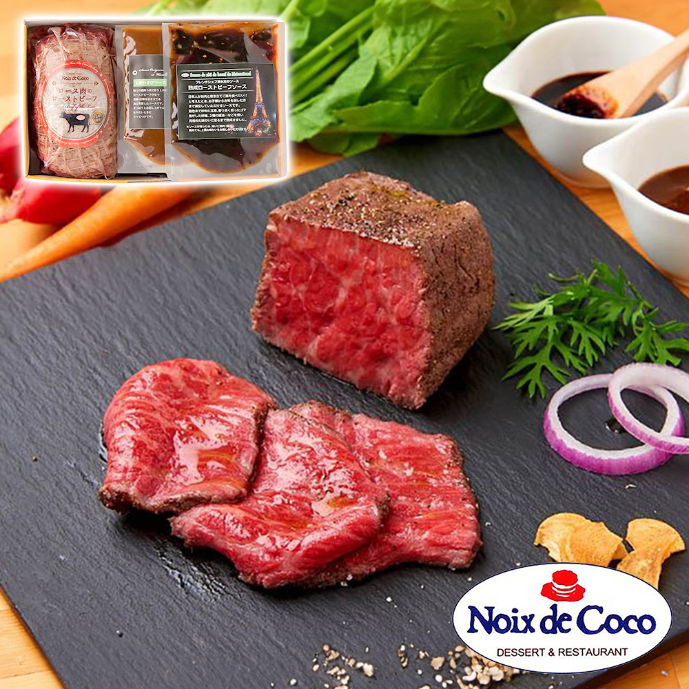 黒毛和牛ローストビーフでベストお取り寄せ大賞殿堂入りを果たした「ノア・ド・ココ 清水シェフ」がプロデュースする『黒毛和牛A4ランクロースのローストビーフ』。メディアなどでも絶賛されたノワドココのプレシャス商品。シェフ自慢の2種類のソースでお楽しみください。