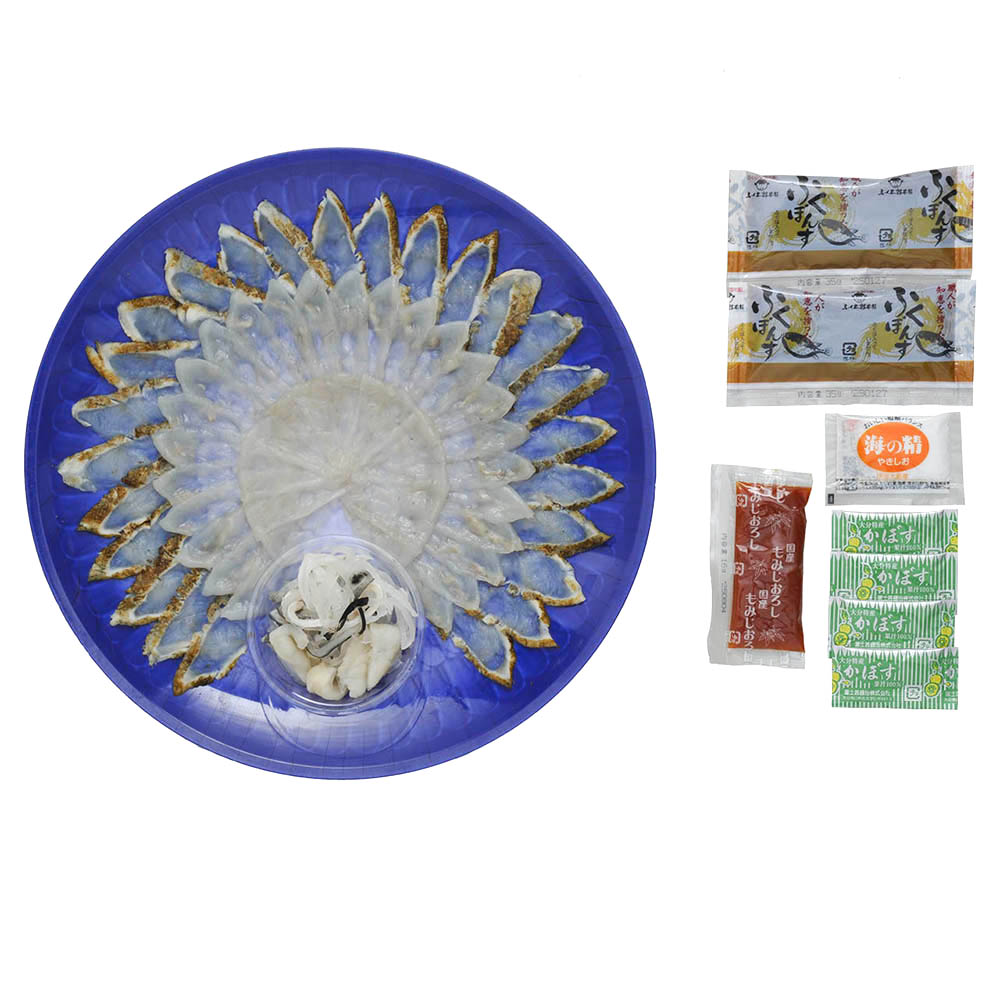 ■規格:まふく炙り刺身75g、とらふく刺身40g、とらふく刺身古式引き20g、とらふく皮30g、プラスチック皿30cm、ポン酢35g×2、モミジオロシ16g、塩5g、カボス果汁2ml×4※刺身皿のデザインは変わる場合がございます。