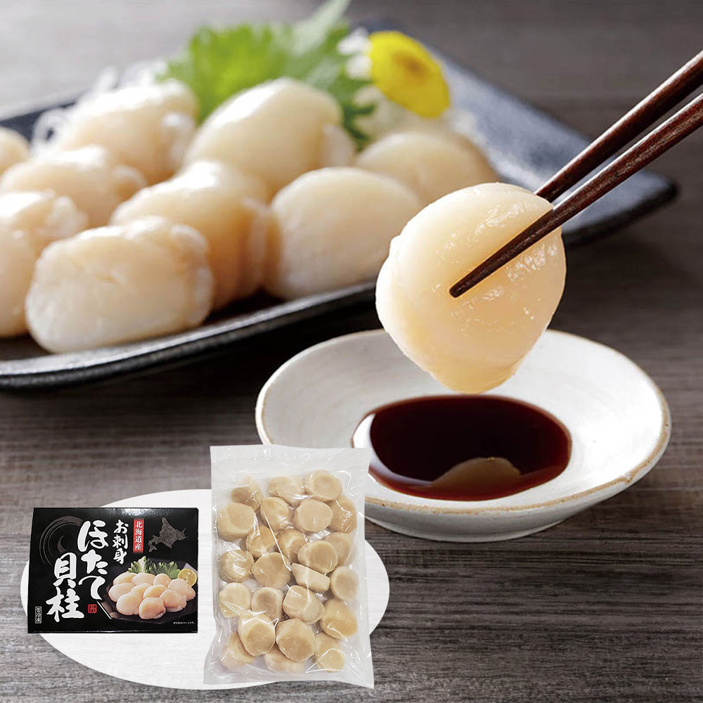 形が揃った正品のホタテ貝柱で解凍後そのまま生食可能です。まずはお刺身でお召し上がり下さい。
