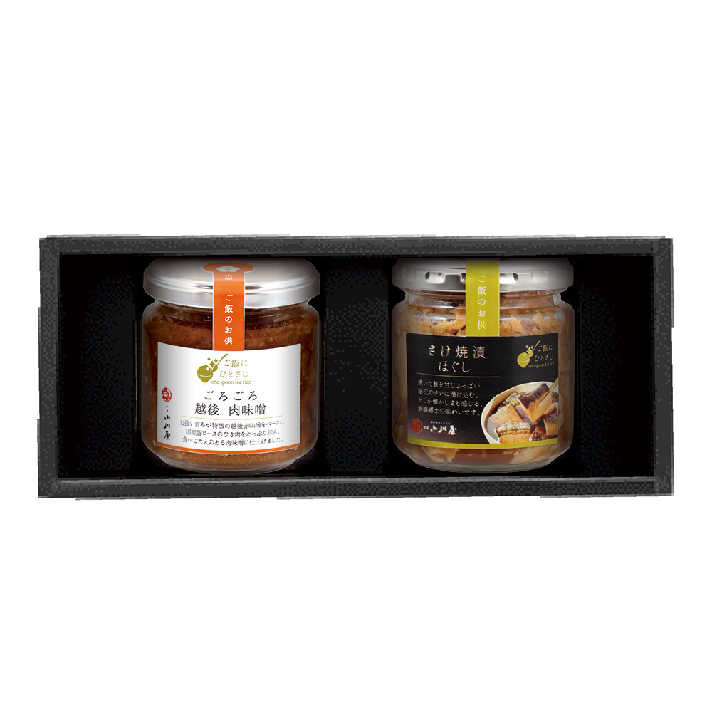 米どころ新潟にお店を構える小川屋がこだわって作る、お手軽でうまいご飯のお供の詰め合わせです。そのままご飯にのせて楽しむだけでなく、アレンジ次第で楽しみ方の幅も無限大です。「ごろごろ越後肉味噌」は力強い旨みが特徴の越後味噌をベースに、国産の豚ロースのひき肉をたっぷり加え、 食べ応えのある肉味噌に仕上げました。「さけ焼漬ほぐし」は新潟の郷土料理であり、人気看板商品「匠の焼漬 さけ」をほぐしにして、余計な骨も取り除いているので、お子様やご年配の方も安心していただけます。