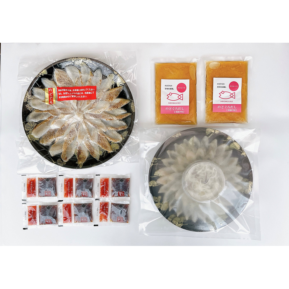 ■規格:トラフグ刺身50g、トラフグ皮刺し30g、のどぐろ炙り刺し120g、のどぐろだし(茶漬け用)100g×2、ポン酢14g×6、もみじおろし2.5g×6