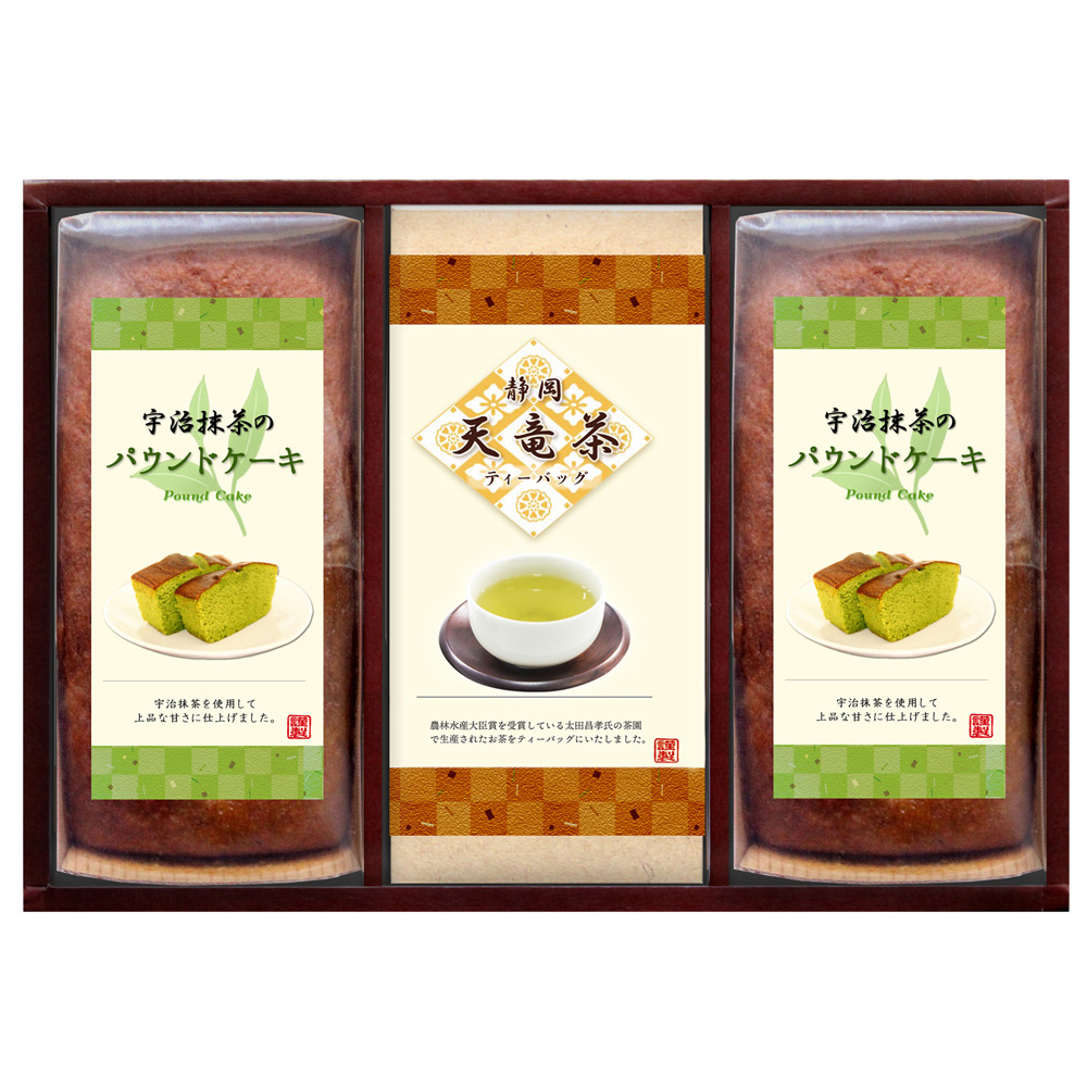 抹茶の風味を十分に楽しめる、上品な甘さとしっとりとした食感の宇治抹茶のパウンドケーキと煎茶のティーバッグの詰合せです。