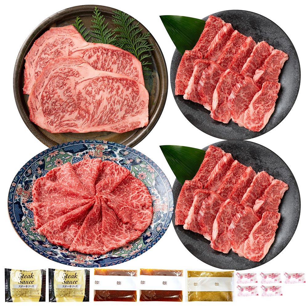 ■規格:オリーブ牛(ロースステーキ180g×2、バラ焼肉用250g×2、赤身スライス(モモorカタ)300g ×1 、ステーキソース25g×2、焼肉のタレ30g×2、ごまだれ50g×1、牛脂×5個