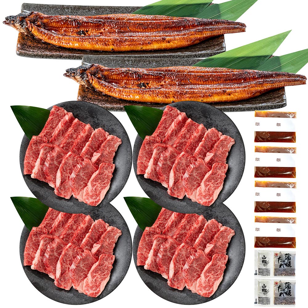 ■規格:オリーブ牛バラ焼肉250g×4、国産うなぎ蒲焼140g×2本、焼肉のタレ30g×4、うなぎのたれ×2