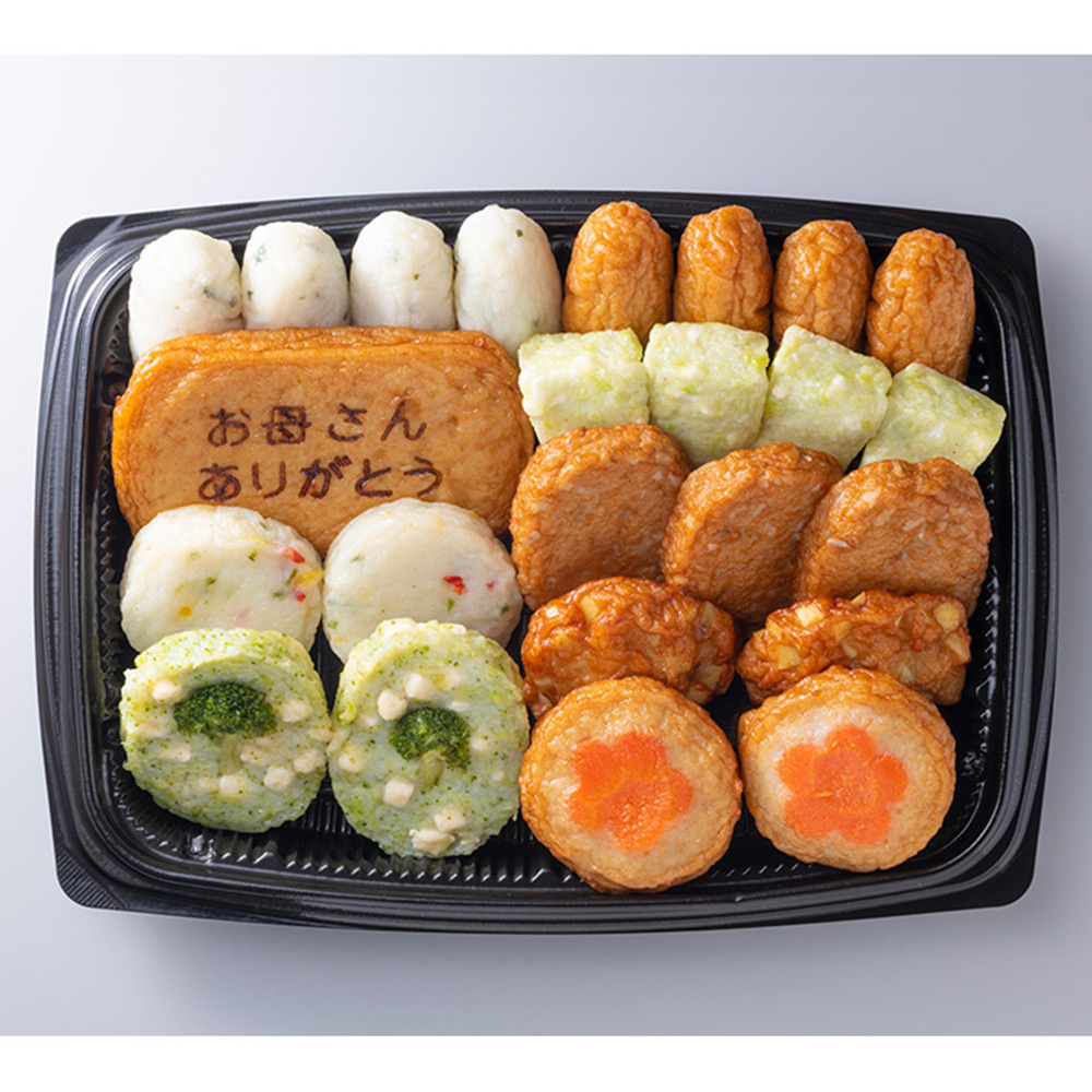 ■規格:しそ天×4、つけあげ×4、メッセージ入さつま揚げ(野菜天)×1、扇枝豆チーズ天×4、ごぼう天×3、パプリカ天×2、さつま芋丸天×2、ブロッコリーマヨさつま×2、人参花さつま×2